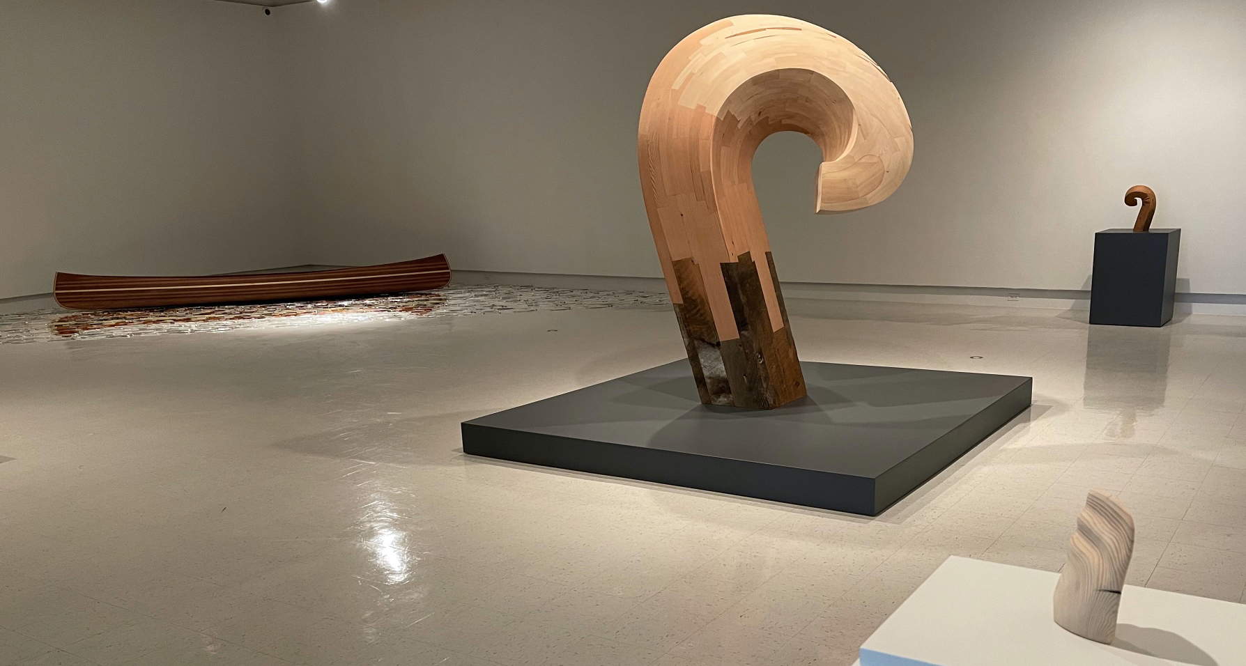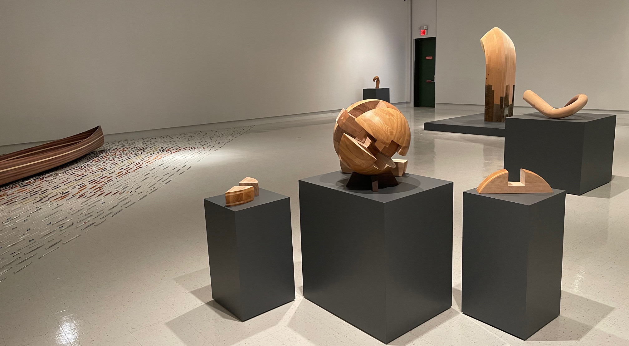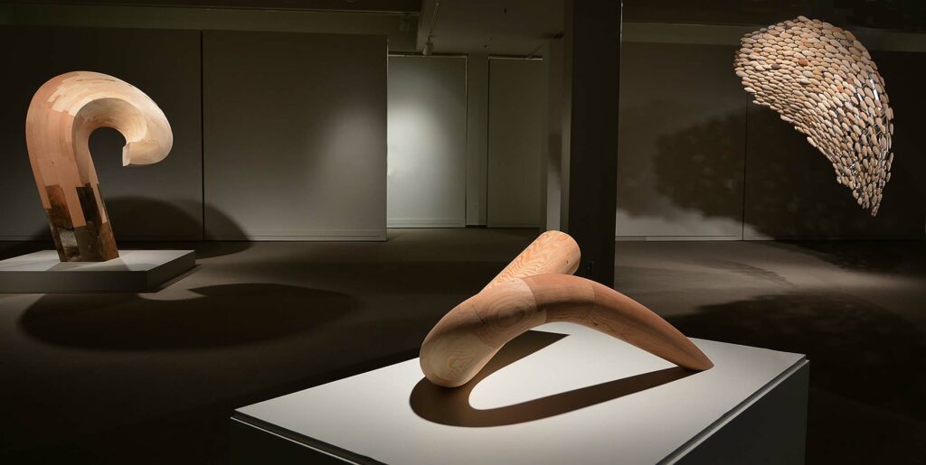 The thoughtfully conceived, designed, and meticulously crafted objects included in this exhibition are the brainchild of Moose Jaw-based artist and master woodworker Peter Tucker. These elegant hand-carved forms are internally composed with complex geometries, uniting a multitude of precision-cut elements, interlocked with intricate joinery, and affixed without the use of fasteners, to make up their seemingly simple exteriors. Although well versed and highly skilled with contemporary power tools, Peter prefers to use exclusively hand tools in the production of these exquisite icons, allowing for his enhanced engagement, feel and control with the medium. Likewise, evidence of his production activities remains “unpolished” in many of the sculptures in order to reference and even foreground the hand-made, human characteristics of the work.