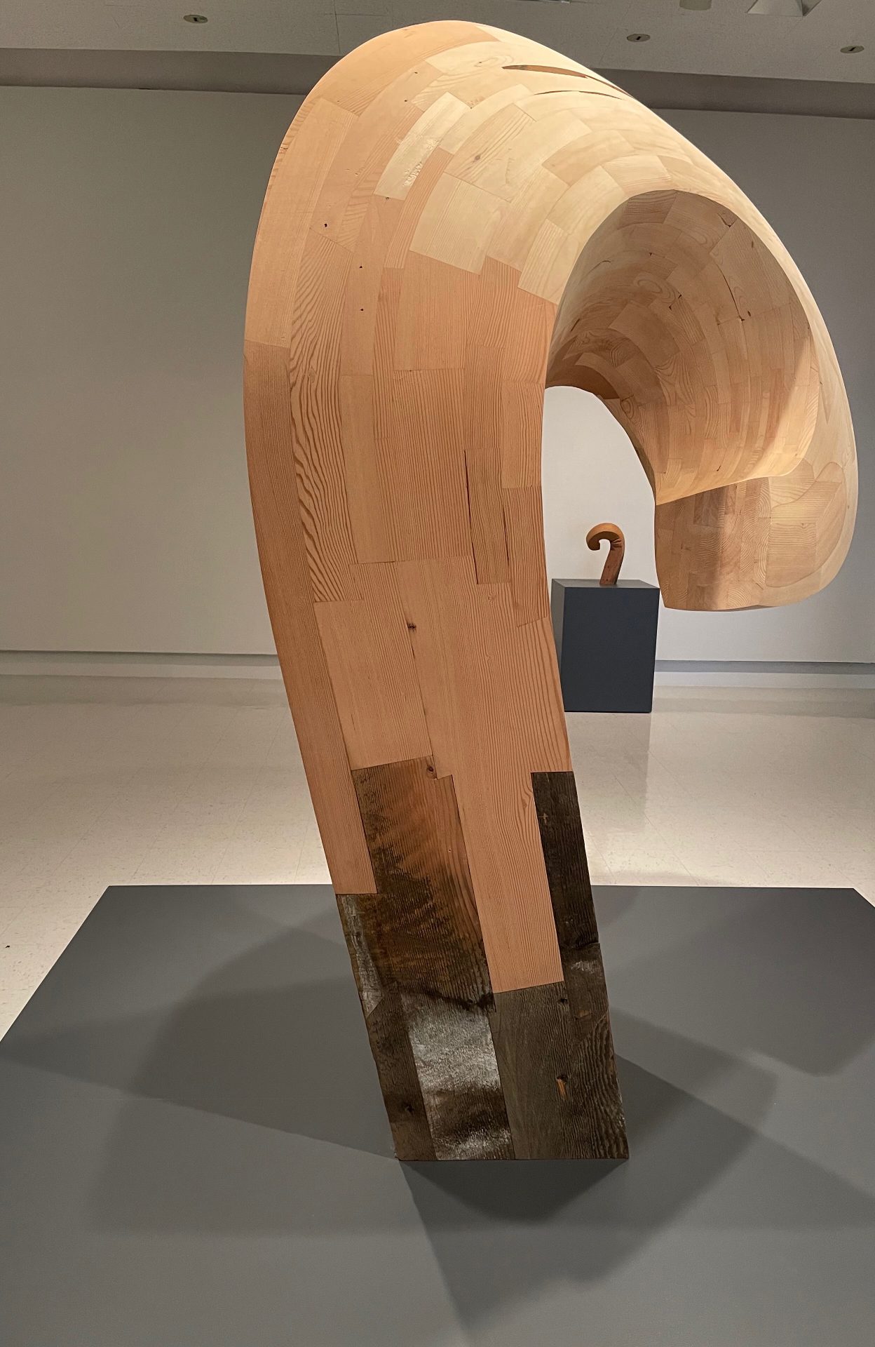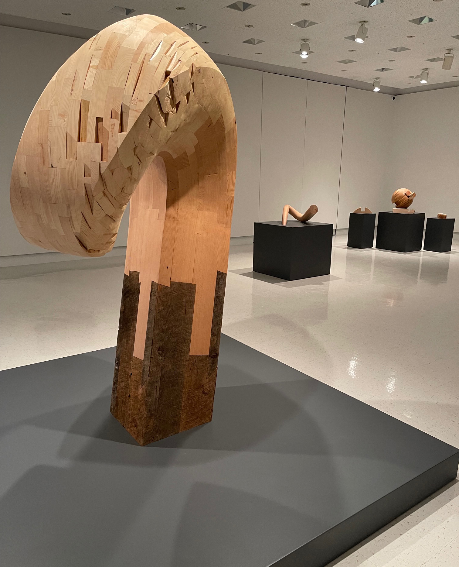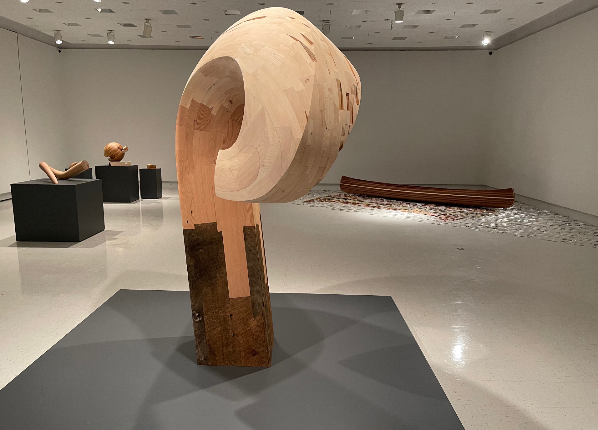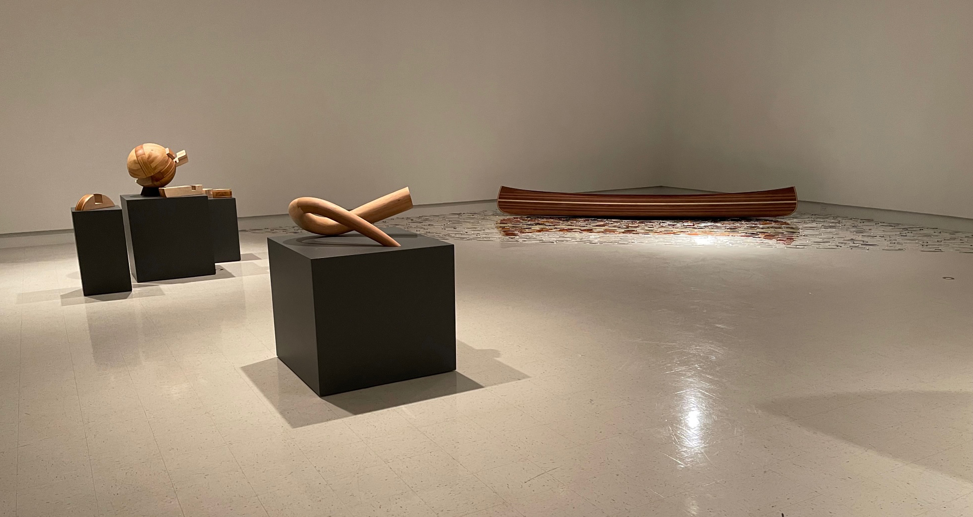 Tucker’s considered, deliberate and conscientious choices of referential and metaphorical forms, selected materials and object scale further activate and accentuate these recurring conceptual touchpoints. The use of reclaimed “non-precious” varieties of wood, the collection and repurposing of all the plastic the artist has used over three years, incorporated into an artwork, the precise locations determined to “clip” a form, to provide perfect balance with implied instability, all echo the artist’s investigations of self, identity and opposing forces in the natural and conceptual worlds.